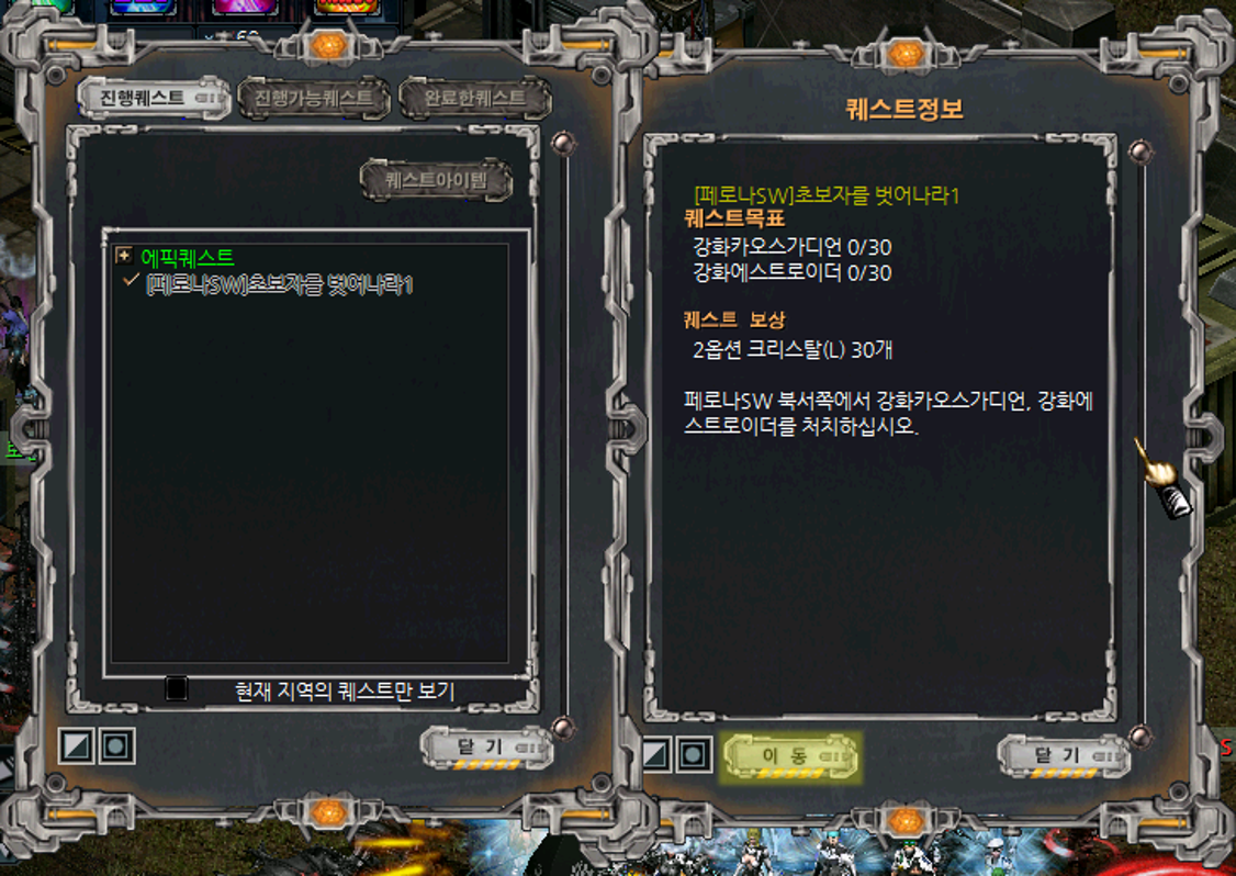 2. 퀘스트 수락 후 '이동' 버튼을 눌러 바로 사냥터로 이동하여 퀘스트를 진행할 수 있습니다.