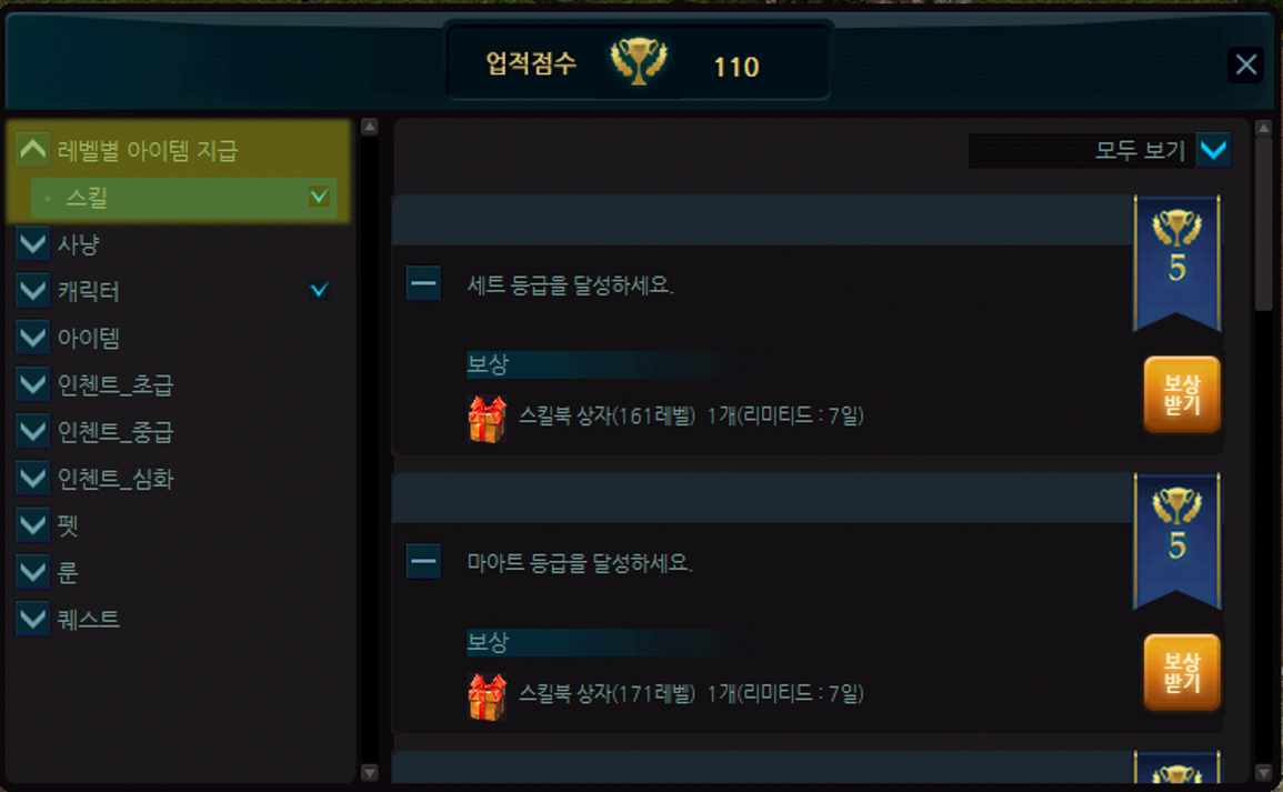 2. 좌측 카테고리에서 레벨별 아이템 지급 탭을 찾아 일정 레벨을 달성하여 스킬북 상자를 획득합니다.