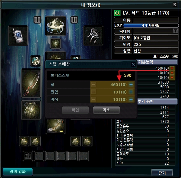 힘, 민첩, 지식 중 보너스 스탯을 투자하여 능력치를 상승시킬 수 있으며, 보너스 스탯 1당 선택한 능력치 1이 증가됩니다.