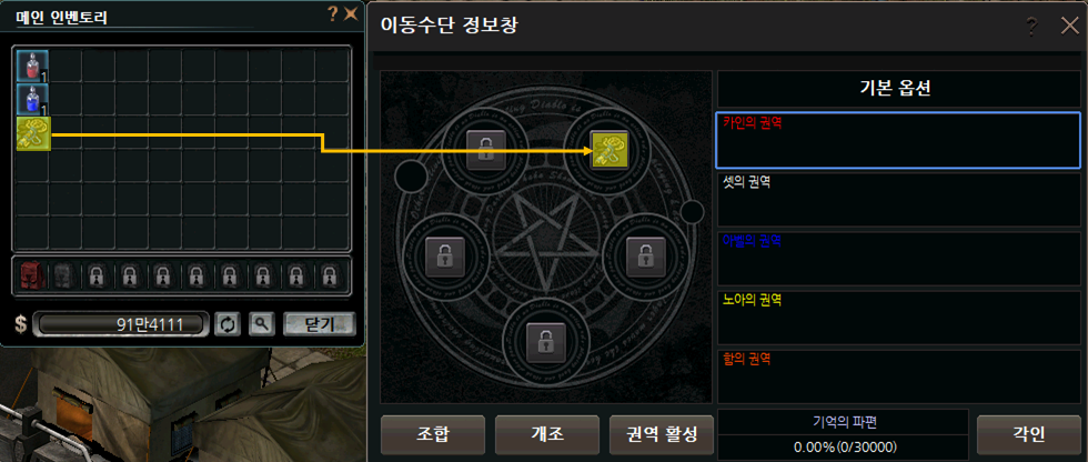 2. 인벤토리에서 이동 수단 아이템을 이동 수단 정보창 빈칸으로 클릭하여 등록합니다.