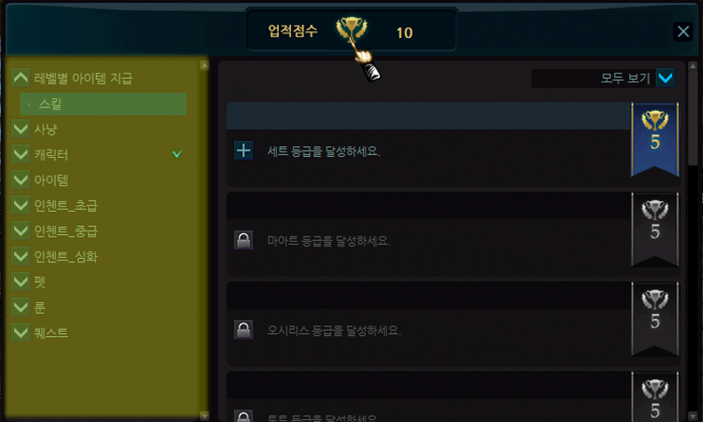 업적을 진행하기 위해서는 업적 별 시작 레벨이 지정되어 있습니다.