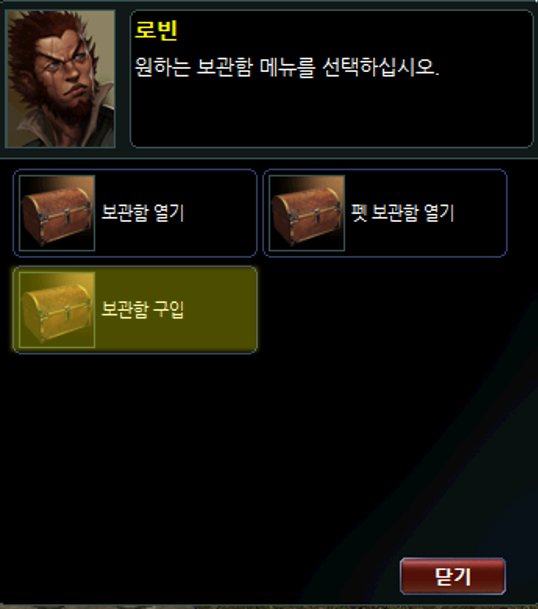 보관함을 구매 하기 위해서는 게임머니가 필요하며, 보관함 NPC에게서 구매할 수 있습니다.