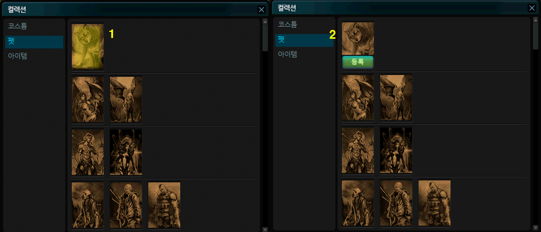 1. '단축키: ['를 통해 UI 활성화한 후 등록하고자 하는 아이템 및 펫 아이콘 클릭 후 등록 버튼을 클릭합니다.