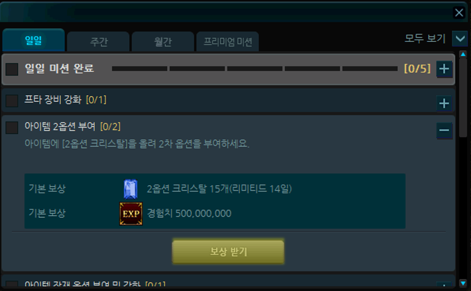 미션을 통해 2옵션 크리스탈, 던전 입장권, 경험치, 경험치 버프를 획득할 수 있습니다.