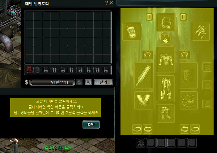 (장착 중인 모든 아이템을 수리를 하려면 장착 중인 장비 중에서 오른쪽 클릭으로 수리 가능)