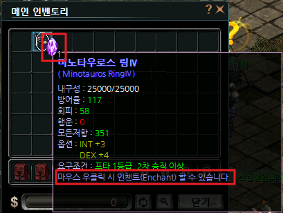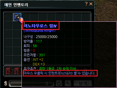 시스템입니다. 인챈트를 통해 아이템의 능력을 강화하면 공격력, 내구력이 상승, 좀 더 강력한 아이템으로 강화할 수 있습니다.