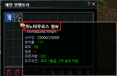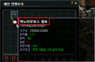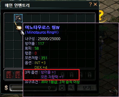 | 모든 능력치 +9, 모든 저항력 +17 | 4.5% | 모든 능력치 +11, 모든 저항력 +21 | 0.5% |