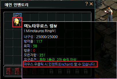 4. 인챈트 성공 시 옵션이 부여된 것을 확인할 수 있습니다.
