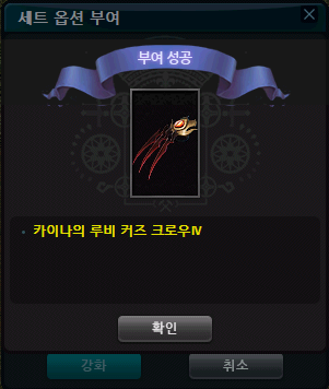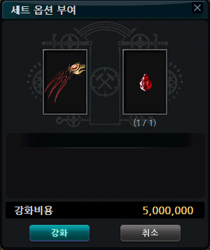 ✔️ 체크 - 신규 세트석(ex. 코퀴토스 세트)의 경우 [프타 등급 아이템], [최강 장비], 게브 등급 이상 특수 방어구], - [성장 향상의 반지], [신뢰의 목걸이] 아이템에 부여 가능하며, 옵션을 부여 할 부위에 구애를 받지 않습니다. - 게임머니 500만이 소모되며, 100% 확률로 부여됩니다.