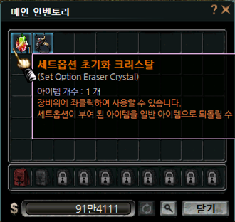 세트옵션 초기화 크리스탈은 세트화된 아이템을 기존의 일반 아이템으로 복원시키는 아이템입니다.