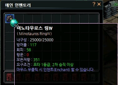 | 획득 계급 경험치 5% 증가 | 3.33% | 몬스터에게 받는 대미지 감소 +60 | 2% | 모든 저항력 +399 | 2% |