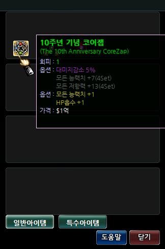 | 5 | 물리 대미지 +10 | 마법 대미지 +10 | 몬스터에게 주는 대미지 증가 +5 | 모든 능력치 +9 |