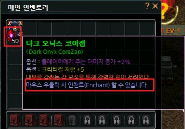 1. 인챈트 할 코어잽과 그에 상응하는 강화석을 인벤토리에 소지합니다.