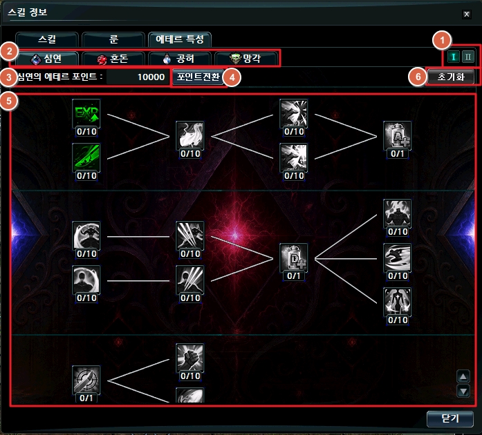 | 5 | 에테르 특성 트리 | 선택한 에테르의 특성 트리 (좌 → 우 방향으로 진행) |