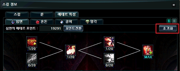 ✔️ 체크 - 초기화 시 선택한 특성만 초기화됩니다. 예> 에테르 Ⅰ 슬롯 > 심연 내에 있는 [초기화] 버튼 클릭 시 에테르 Ⅰ의 심연 내 특성만 모두 초기화됩니다. - 초기화 시 사용한 에테르 포인트만 반환되며, 게임 머니는 반환되지 않습니다.