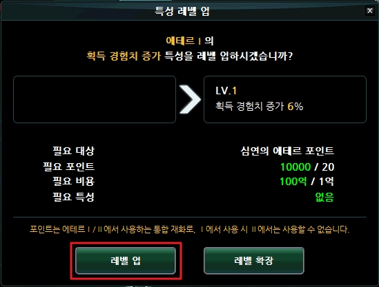 ✔️ 체크 - 레벨업 시 해당 특성의 포인트 및 게임 머니가 필요합니다. - 포인트는 에테르 Ⅰ / Ⅱ 에서 사용하는 통합 재화로, Ⅰ에서 사용 시 Ⅱ에서는 사용할 수 없습니다. - 특성은 좌에서 우, 그리고 위에서 아래로 진행되며 전 단계 특성이 비활성화 상태인 경우, 다음 특성을 습득할 수 없습니다. 예> [HP 흡수 증가]를 습득하기 위해서는 이전 특성인 [획득 경험치 증가 또는 대미지 증가]가 활성화 상태여야 합니다. - 동일한 특성 순서를 가진 특성은 1개만 선택, 습득할 수 있습니다. 예> [획득 경험치 증가, 대미지 증가]의 경우 특성 순서가 동일하게 1이기에 선택해서 1개만 습득할 수 있습니다.