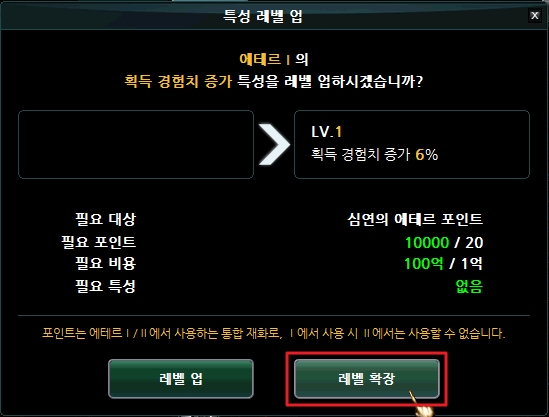 1. [에테르 레벨 확장 스크롤] 아이템을 인벤토리에 소지한 채, 특성 아이콘을 클릭, [레벨 확장] 버튼을 클릭합니다.