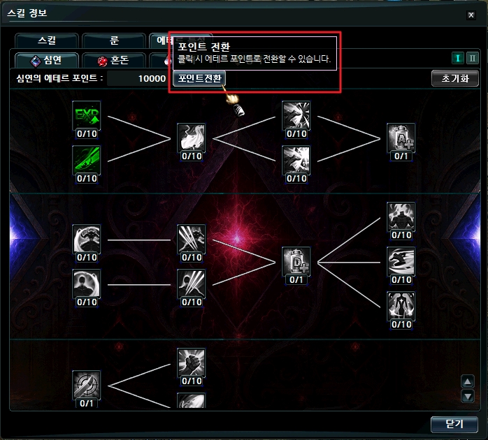 예> 심연의 에테르 포인트로 전환 시 에테르 Ⅰ 또는 Ⅱ > 심연 탭 내에 있는 포인트 전환 버튼 클릭