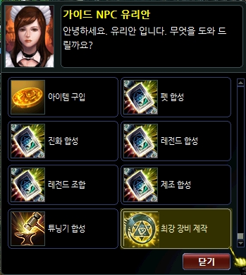 3. 제작 NPC > 최강 장비 제작 > 최강 장비 제작 버튼을 클릭합니다.