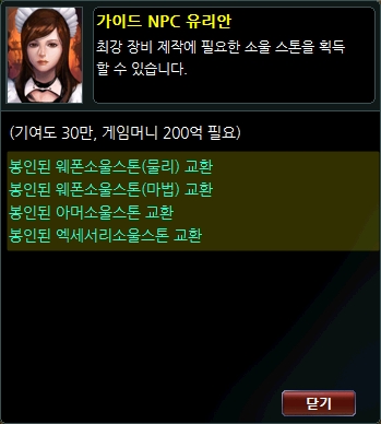 ✔️ 체크 - 제작 부위에 따라 필요한 재료 아이템에 차이가 있습니다. - 봉인된 OO 소울스톤 아이템 교환 시 기여도 30만, 200억의 게임머니가 필요합니다.
