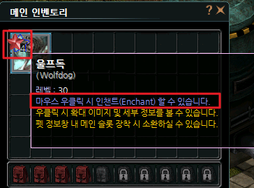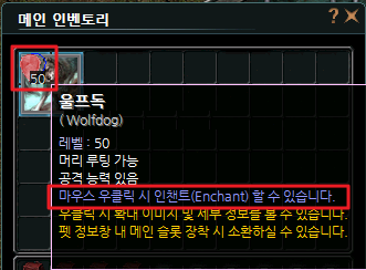 1. [레드 드롭] 아이템을 인챈트 할 펫 아이템에 마우스 포인터를 올린 후 우클릭합니다.