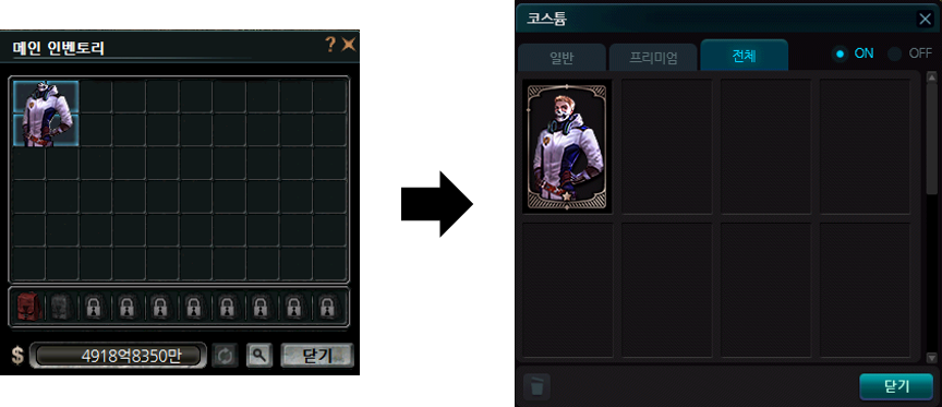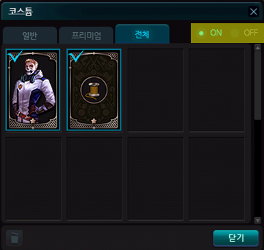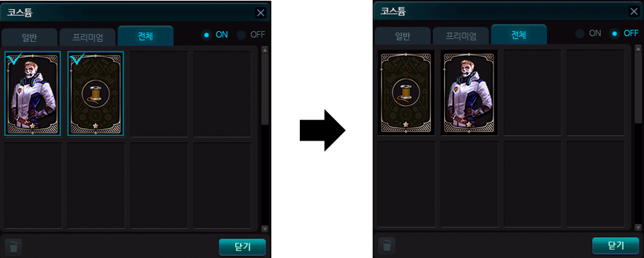 코스튬 전용 보관함 ON/OFF를 통하여 적용된 외형을 활성화/비활성화할 수 있습니다.
