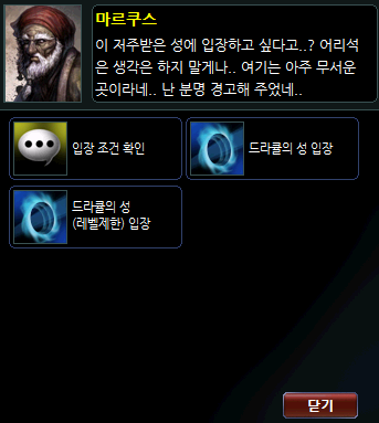 2. NPC 창에서 던전 이동 > [드라큘의 성 입구] 메뉴를 클릭합니다.