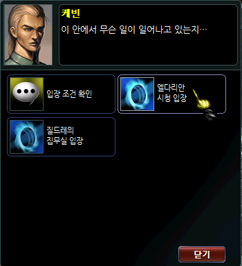 2. NPC 창에서 던전 이동 > [엘다리안 시청 입구] 메뉴를 클릭합니다.