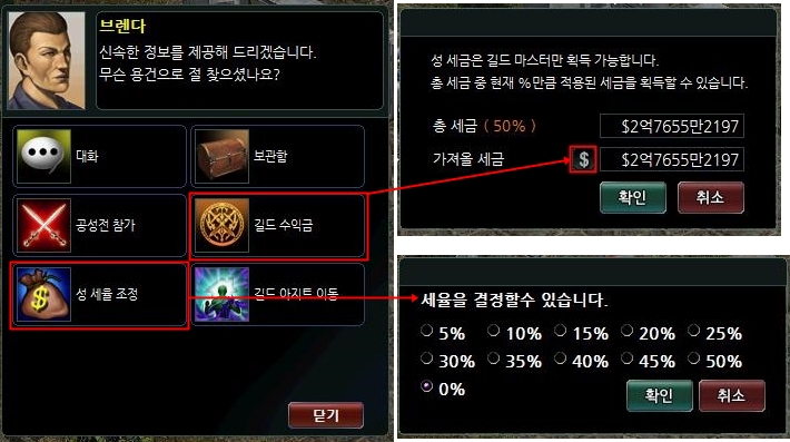 보유한 성의 수익금 관리 NPC에게서 세율을 조절하고, 수익금을 수령할 수 있습니다.