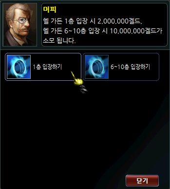 ✔️ 체크 - 5층까지는 1층으로 입장한 후 내부의 수정구 NPC를 통해 이동할 수 있으며, 추가 게임머니는 소모되지 않습니다. - 6 ~ 10층까지는 입장 시마다 게임머니가 소모됩니다. - 헬 가든 던전 내에서는 소울 체인 및 커플링 사용이 불가합니다.