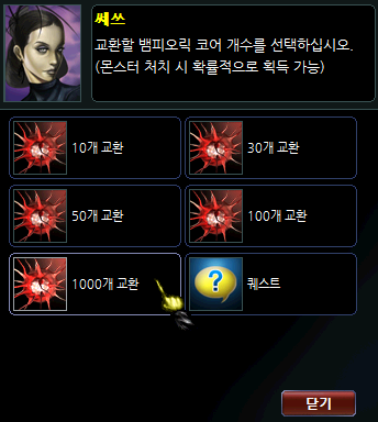 | 교환 시 필요 아이템 | 필요 개수 | 교환 아이템 및 개수 | 옵션 | 비고 |