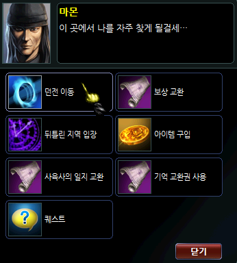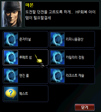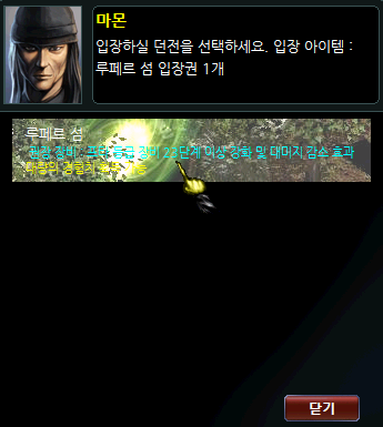 2. NPC 창에서 던전 이동 > 루페르 섬 메뉴를 클릭합니다.