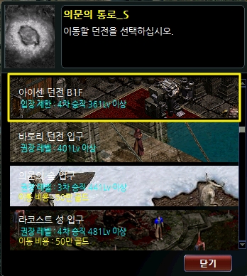 2. NPC 창에서 던전 이동 > 아이센 던전 B1F 메뉴를 클릭합니다.