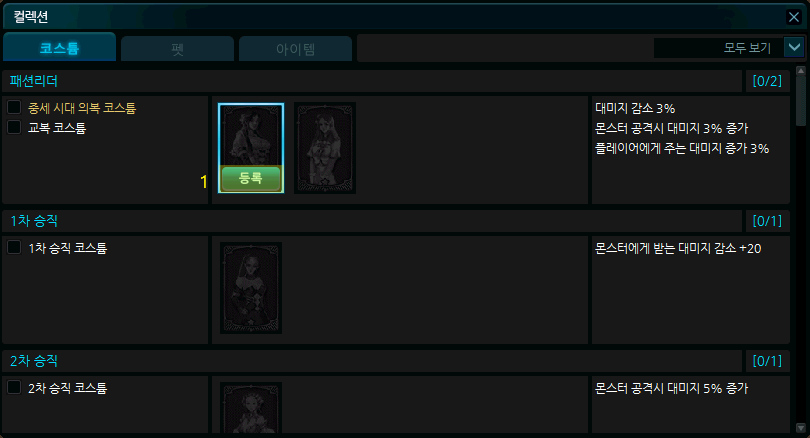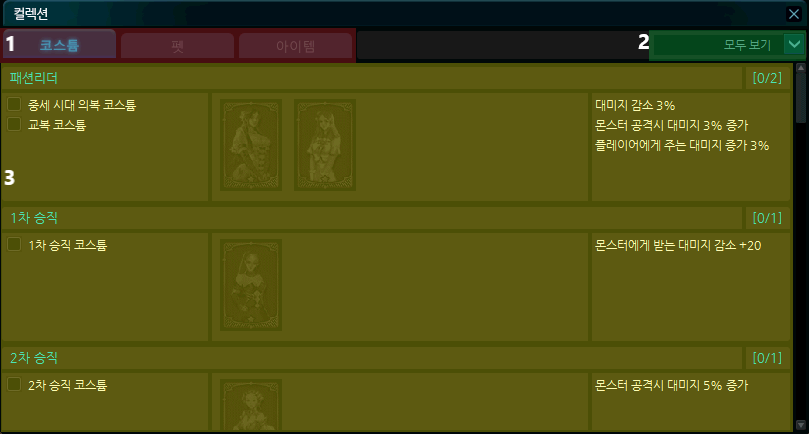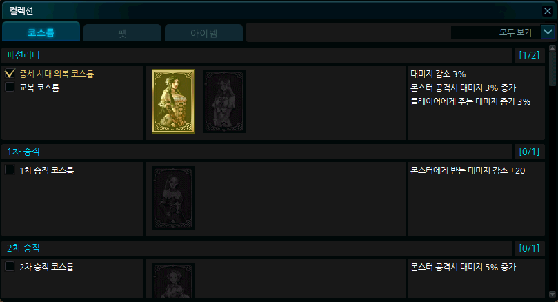 | 2 | 패션 리더 | 중세 시대 의복 코스튬, 교복 코스튬 | 대미지 감소 3%, 몬스터 공격시 대미지 3% 증가 플레이어에게 주는 대미지 3% 증가 |
