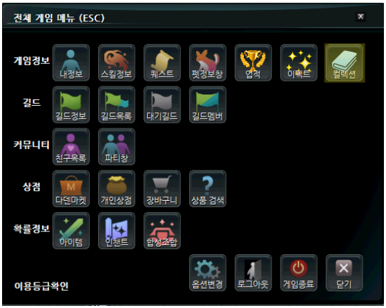 컬렉션은 게임정보(ESC) > 컬렉션 메뉴 또는 ( 단축키 : [ ) 을 눌러 확인할 수 있습니다.
