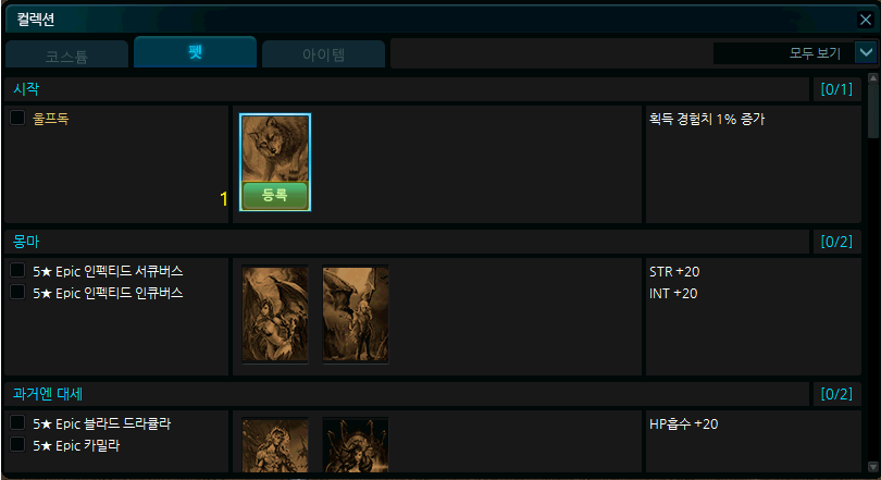 자동으로 컬렉션 아이템 등록되는 구조1. 등록 가능한 아이템이 인벤토리에 존재할 경우 해당 아이템 컬렉션에 등록 버튼이 활성화 됩니다.
