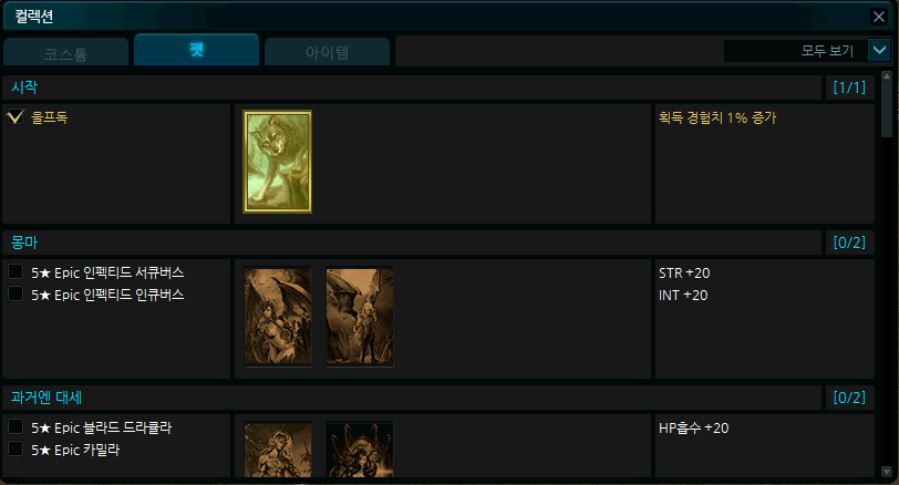 | 2 | 컬렉션 필터 | 필터로 설정하여 조건에 맞는 컬렉션을 확인할 수 있습니다. ㄴ 모두 보기 : 탭 내 모든 컬렉션 리스트를 확인할 수 있습니다. ㄴ 미달성 컬렉션 : 탭 내 미달성한 컬렉션 리스트만 확인할 수 있습니다. ㄴ 달성 컬렉션 : 탭 내 달성한 컬렉션 리스트만 확인할 수 있습니다. |