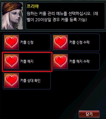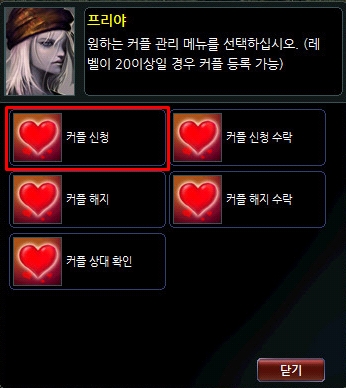 1. 캐릭터 레벨 20 이상(2018.11.08 업데이트 이전 생성 캐릭터) 2. 커플 등록 비용 필요 커플 등록비: 캐릭터 레벨 x 10만 게임 머니 |