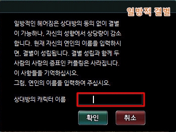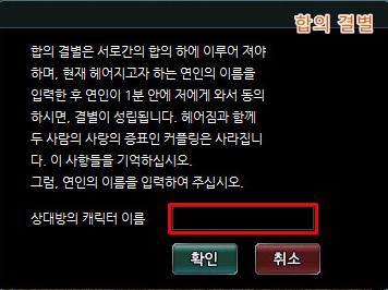 3. 결별할 상대방의 캐릭터를 입력한 후 확인 버튼을 클릭합니다.