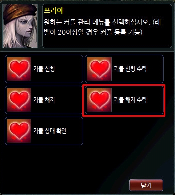 상대방과 결별을 원할 경우 커플 등록 NPC를 통해 상대방과의 커플 등록을 해지할 수 있습니다.