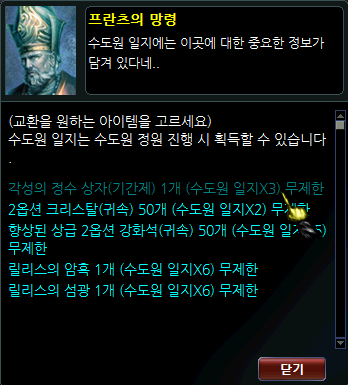 | 퀘스트 보상 | 하얀 빛의 성장 촉진제(L) 1개 수도원 정원 입장권(L) 1개 전장의 명예 - 골드(L) 5개 |